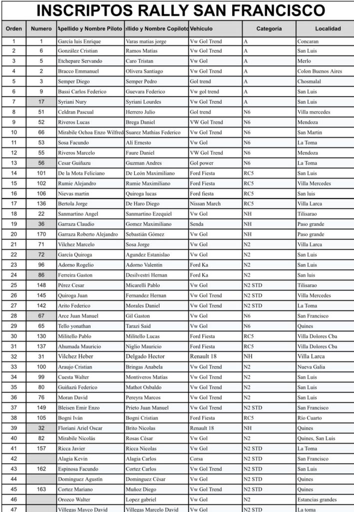 El listado de participantes incluye a referentes destacados de todas las categorías. En la Clase A, aparecen nombres fuertes como Cristian González, Luis García, Servando Etchepare, Federico Bassi y Nury Syriani, todos al mando de VW Gol o Gol Trend, autos insignia de esta divisional.