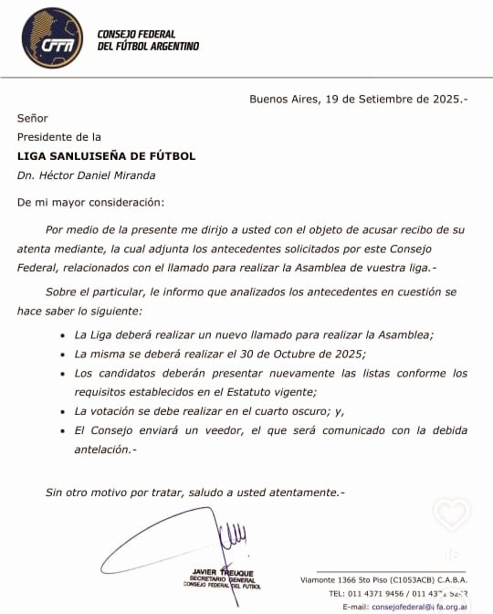 El Consejo Federal de Fútbol Argentino le comunicó oficialmente a la Liga Sanluiseña de Fútbol la obligación de realizar un nuevo llamado a Asamblea, luego de analizar los antecedentes remitidos por la institución puntana.