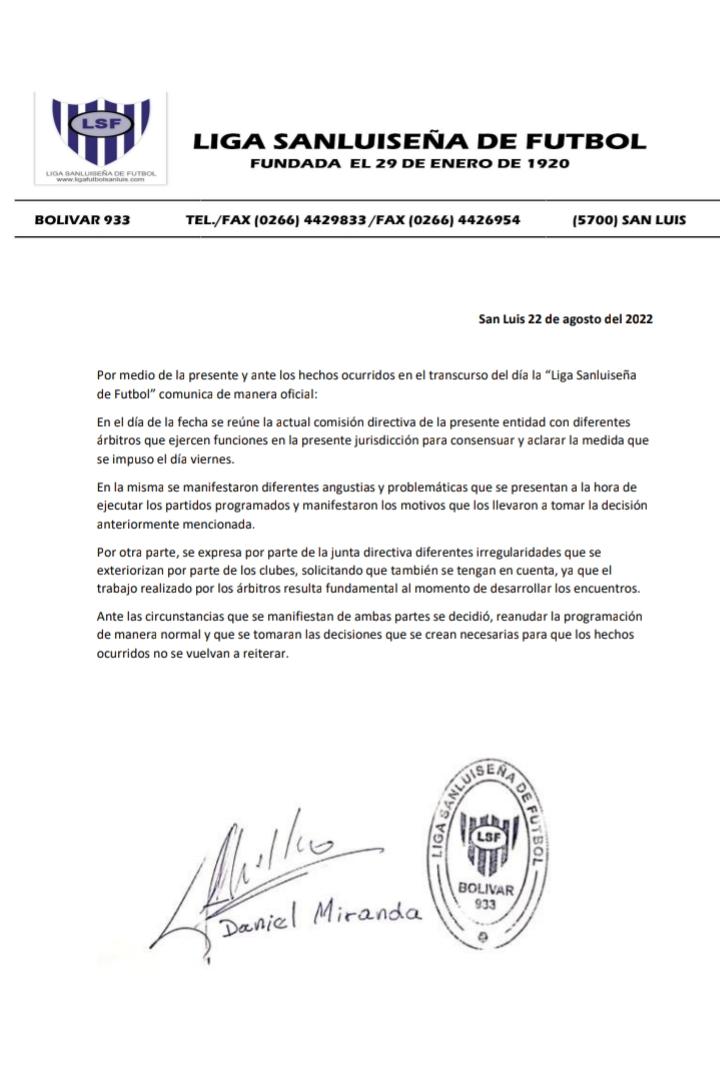 Mediante un comunicado de prensa, la Liga Sanluiseña de Fútbol (LSF) confirmó que este fin de semana se reanudan sus torneos luego de mantener una reunión con los árbitros.
