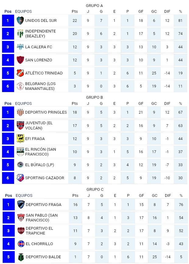 Con chances de clasificar aparecen San Pablo y Atl. El Rincón de San Francisco, Dep. El Trapiche, La Calera FC, San Lorenzo, EFI de Fraga y El Chorrillo.
