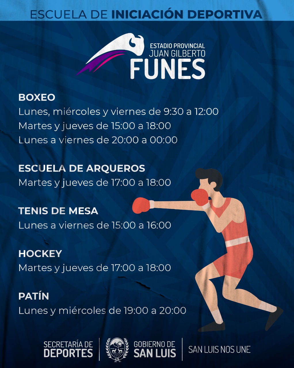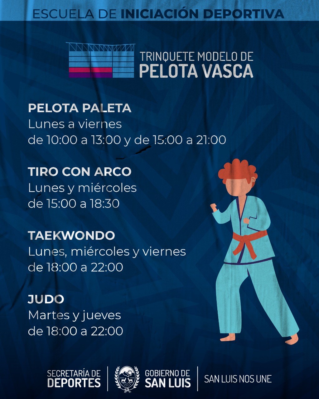 Las escuelas deportivas son uno de los pilares de la política deportiva de la Provincia. Se trata de espacios a los que pueden asistir personas de todas las edades para practicar deportes y actividades recreativas, como fútbol, vóley, básquet y handball; además de la escuela de arqueros, básquet 3×3 y tiro con arco, entre otros.